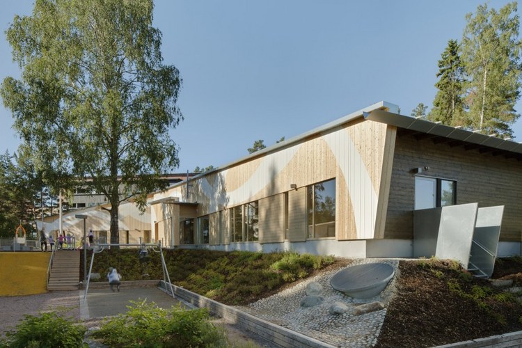 Omenapuisto日托中心位于芬蘭赫爾辛基,整個建筑主要的由單層體量構成,兩層高的部分是一個多功能的高挑空......