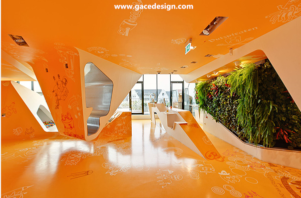 整個KU65 Kids Club的內部顏色選用來鮮亮的橙黃色與白色搭配,所有被“切開”的斷面皆為白色。桔黃色的表面上印有各種有趣的卡通圖案與涂鴉,甚至還有類似攀巖的墻壁。很難想象這里竟是一家醫療保健機構,所以項目名為KU65 Kids Club就容易理解了。幼兒園設計