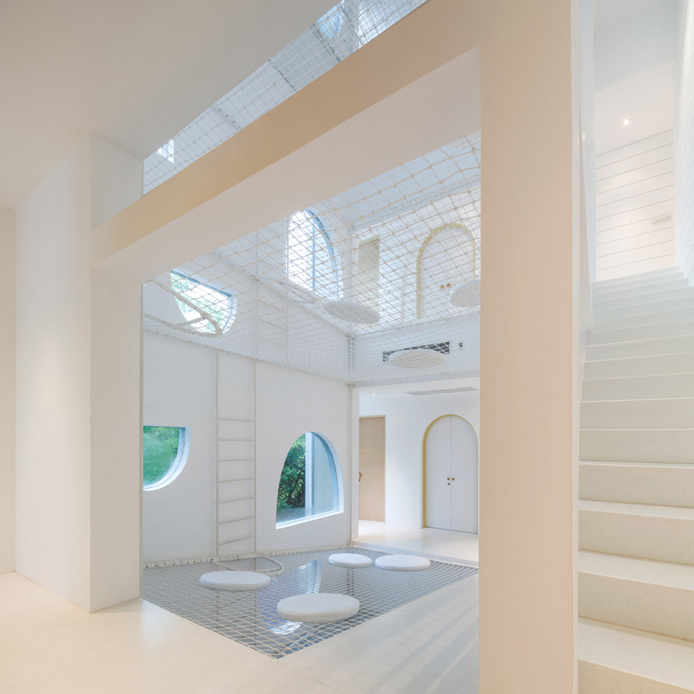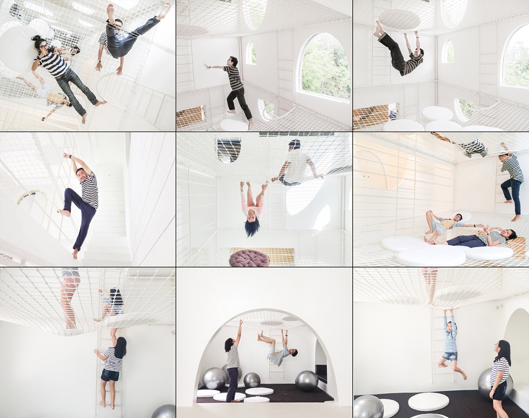 由于有下層繩網(wǎng)的保護(hù),孩子們跳出床外或掉進(jìn)孔洞都不會(huì)產(chǎn)生危險(xiǎn)。懸吊在繩網(wǎng)上成為一種新玩法。抬頭看向天花板上的鏡面時(shí),吊掛在繩網(wǎng)上的人似乎懸浮在空中,層疊的網(wǎng)層看起來比它們實(shí)際的高度更高。