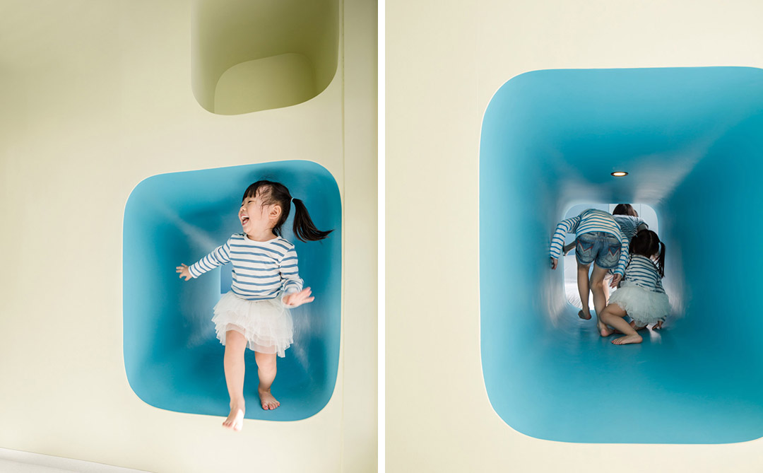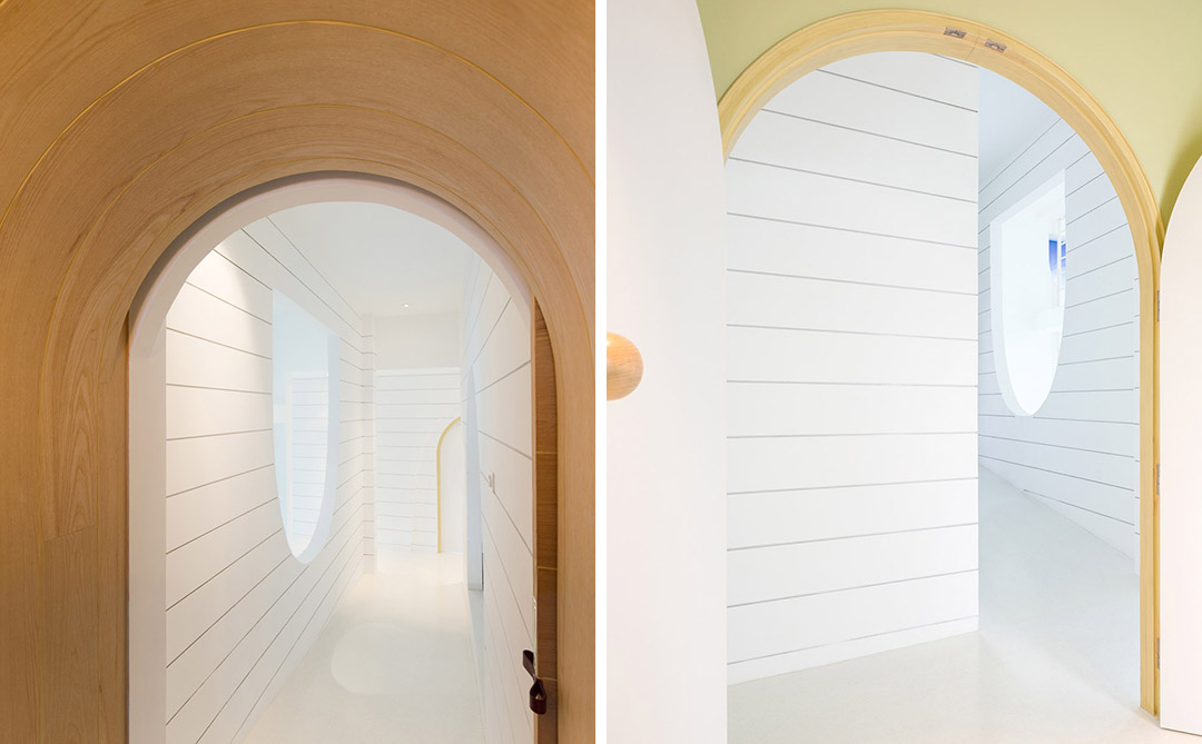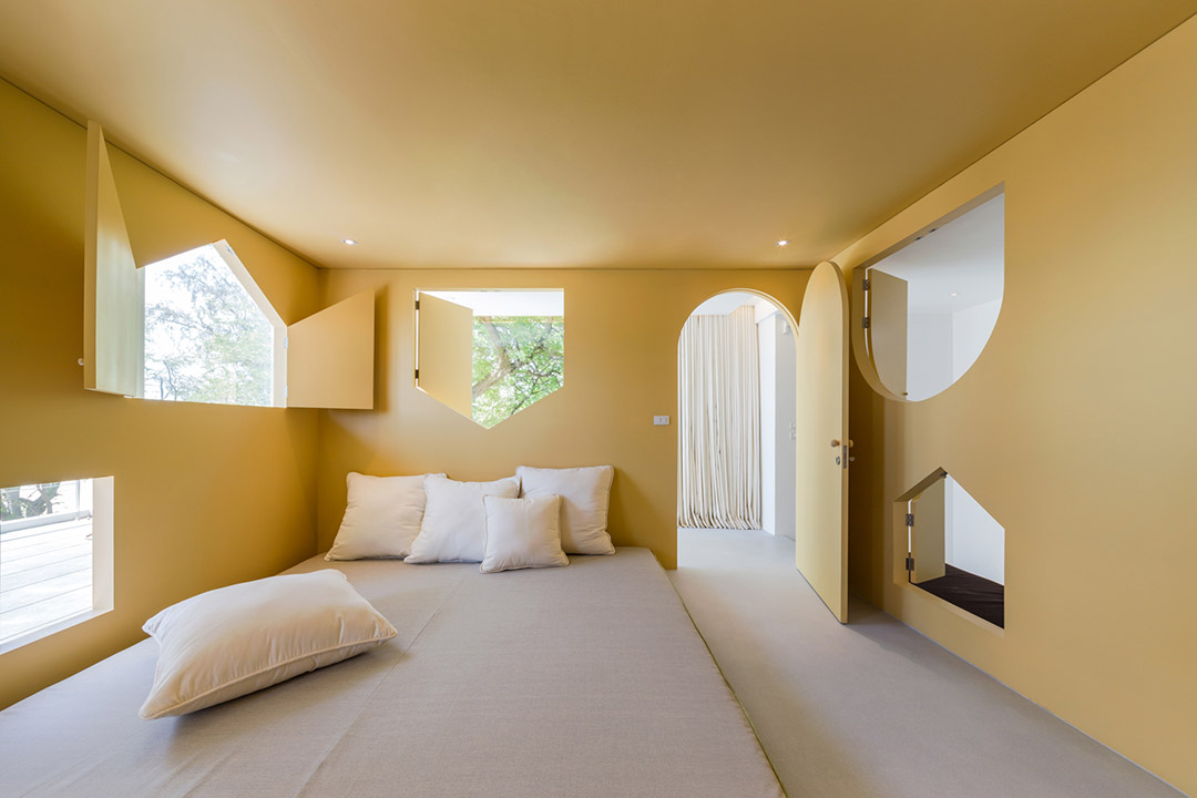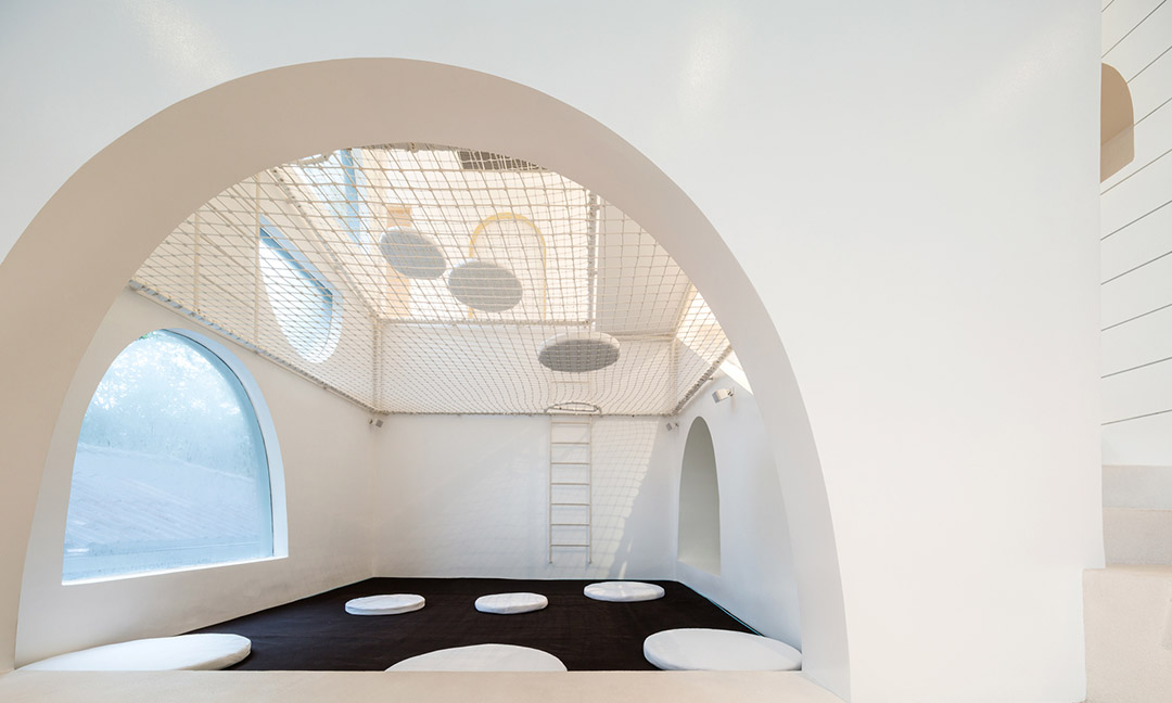 跑、爬、藏、懸掛、甚至下落等身體活動(dòng)在日常生活中并不常見。Onion將1940年上映的美國(guó)動(dòng)畫片“貓和老鼠”作為該項(xiàng)目室內(nèi)設(shè)計(jì)的參照標(biāo)桿。如果Jerry為自己修建房子的話,很有可能會(huì)是一個(gè)巨大的奶酪房,里面設(shè)有幫助自己躲避Tom追趕的“莫比烏斯圈”逃跑路線。建筑師將該住宅設(shè)計(jì)成一個(gè)深受孩子們喜愛的樂園,讓全家在七巖海灘的假期更有意義。