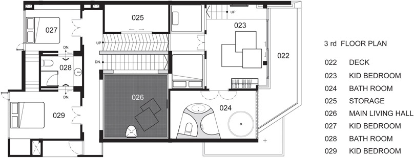 主生活廳為包括祖母在內(nèi)的每一個(gè)家庭成員帶來了愉快的假期時(shí)光,這里成為Jerry House最常用和最富生氣的空間。孩子們甚至不愿意睡在臥室,而是將枕頭和被子拿到繩網(wǎng)上來睡覺。他們睡在相當(dāng)于二層半的第四層繩網(wǎng)上。Jerry House讓孩子們睡在空中的夢(mèng)想成為現(xiàn)實(shí)。
