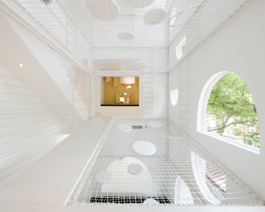 Onion用定制的繩網(wǎng)打造了五層不同傾斜度、高度及尺寸的水平網(wǎng)層。五層繩網(wǎng)在三層高的生活廳內(nèi)充當(dāng)著地板的角色,并且分別在每一層的不同位置設(shè)有一個(gè)孔洞。父母和孩子們可以通過金屬樓梯從地面層爬到三樓的一間兒童房。