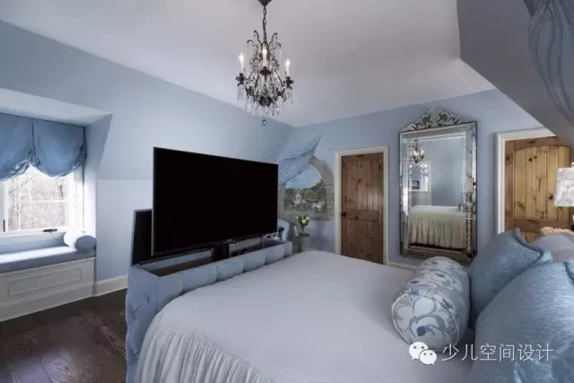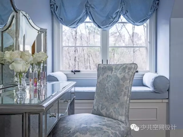 柔和的板藍色和銀色用來打造像公主一樣的宮殿。設計師給她設計一個特別舒適的窗口角落,也方便閱讀。從流動的瀑布式窗口處理的啟示進行概念設計的手繪壁畫。在床上,還定制了床罩和枕頭等匹配裝飾的家居用品。