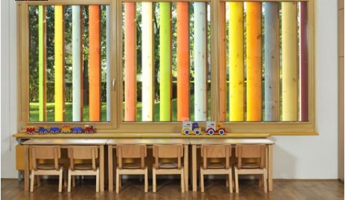 由于周圍社區兒童數量的不斷增加,Kekec幼兒園決定擴建一間游戲室,由JureKotnik建筑公司進行設計。考慮到這是一個為兒童服務的建筑,因此最重要的設計元素就是色彩,除此之外,設計師還希望新建筑的樣式更加靈活,融入一些玩具的特點,讓孩子們能夠與之互動,從而增添一些娛樂性。而實現以上幾點只需要一個機關——像百葉窗一樣會“轉”的墻壁。