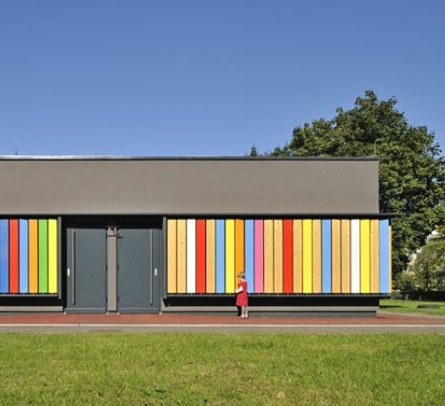游戲室的一面墻與主樓相接,另外三面墻壁全部由木板組成,這些木板就如同百葉窗的葉片,可以繞著中央的金屬軸轉動。木板的一面保留木材的原色,另外一面總共刷上了9種鮮艷的顏色,拼在一起就像是彩色的琴鍵。