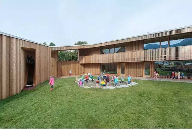 在小鎮的教堂附近,有一座新建的占地950㎡的幼兒園,幼兒園有一個大大的露天庭院,院里種植這草皮,還設計有一小塊沙地,孩子們可以在這小沙池中玩耍,靠近庭院的一面墻體的設計也是非常有意思,里面是安裝了木梯的攀巖墻,還有一部滑梯,所以即便是雨天,孩子們也可以在這個小天地里愉快的玩耍。幼兒園的設計也遵循著小鎮的風格漆白的墻面外部用木材裝飾和周圍的小鎮建筑以及自然景物,和諧相融。