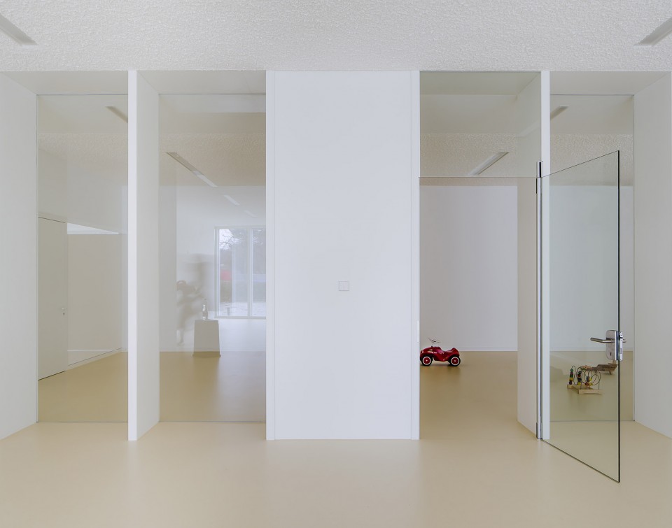 建筑師將房間凈高最大化,并引入了新的窗戶系統,使改造后的建筑內每一個房間都可以獲得充足的光照。此外,平面布局最大化了不同功能之間的透明性,小組活動室、餐廳以及辦公室和廚房等流線和服務空間之間均以玻璃做隔斷,保持視覺上的暢通。不僅如此,小組活動室的隔墻與玻璃立面以玻璃連接,形成聯系不同房間的視覺軸線。在建筑外觀,前部由樹籬圍成了花園空間。(幼兒園室內設計