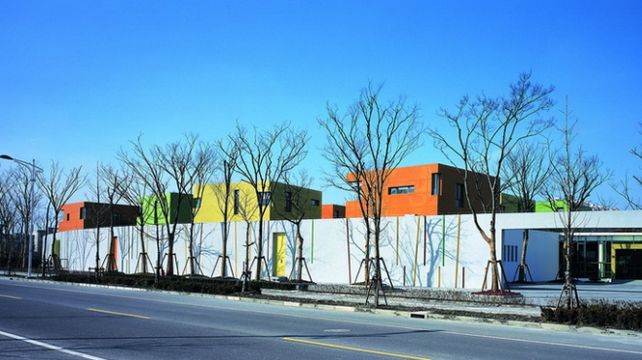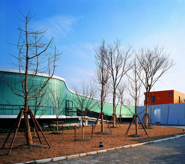 幼兒園總共設有15個班級,每個班都有自己獨立的活動室、餐廳、臥室和室外活動的場地,于是15個班級的教室和教師辦公及專用教室部分被分為兩大曲線圍合的組團,班級教室部分的曲線體是落地的實體涂料圍墻,辦公和專用教室部分是有意抬高并周邊出挑的U型玻璃圍墻。