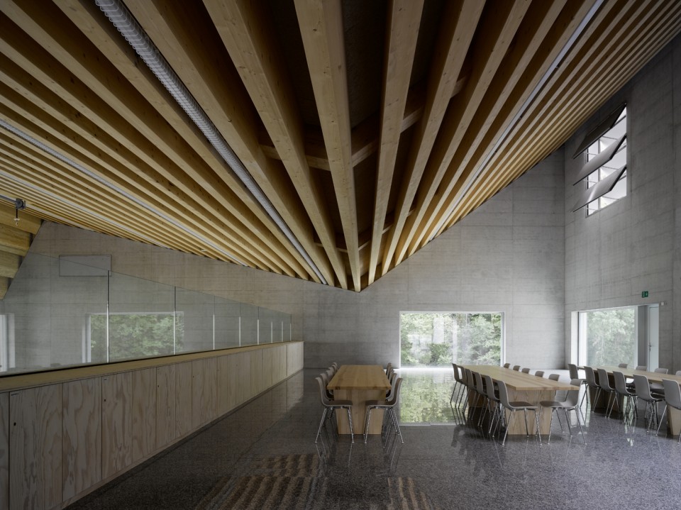 整個建筑的山墻朝向南北,與城市肌理相契合。承重墻、樓板與立面組成承重系統以鋼筋混凝土構筑而成,以求達到當地相關部門對抗震的要求。屋頂結構的兩重結構皆有木材制成,而外層則覆蓋著金屬薄片,而類似的,建筑的立面也由魚鱗般的金屬般構成。遠遠看去,建筑仿佛呼應著周圍的群山,錯落起伏。相互穿插的方形體量組合出疏密有致的空間,而高低起伏的屋頂從東向西延伸。新建的學校活動中心延續了校園現有的空間秩序,同時也與周邊的傳統建筑形式遙相呼應。