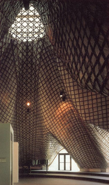 在社區中心的幼兒園是以一個正方形的網格作為模數基礎,在中央隆起一個三維褶皺的建筑表皮,看上去就像是在地上鋪上一塊巨型的手帕然后抓起來的感覺,褶皺的骨骼部分是由綠色環保的竹子編制而成,采用竹子編織形成一個竹子網格曲面有著巨大的空間,在竹子外部在增加上保溫層最外層則是用鋼筋混凝土作為整個建筑的“外衣”,整個建筑在園方看過去就想是隨風飄動的少女裙擺十分的引人注目。