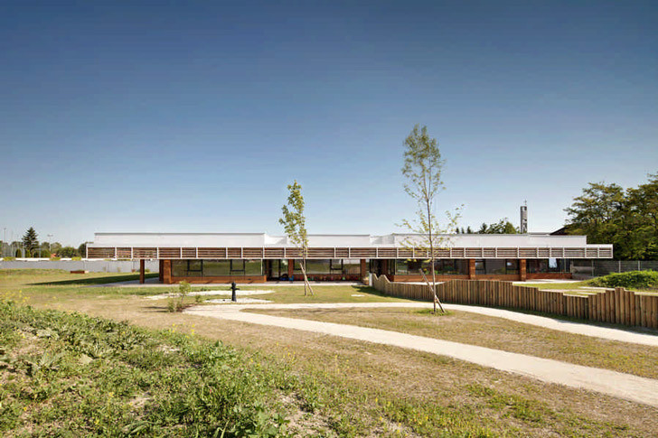 屋頂的設計和開放活動室形成一個新的介于內部與外部之間的空間。通過在南北方向的單位位移,在活動室之間形成了視覺連接效果。這個專門為幼兒園設計的活動室完全可以融入教學工作中。