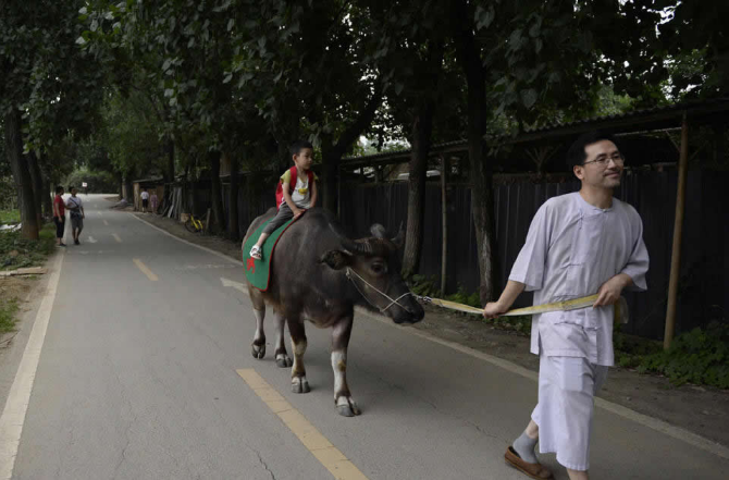 父親醉心國學,帶3歲兒子騎上黑色大牛去上學