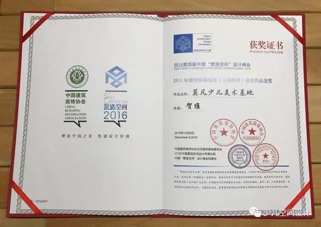 2016年12月,由中國建筑裝飾協(xié)會指導(dǎo),CCSD中國營造空間設(shè)計師俱樂部、《飾界人物》雜志社主辦,北京大易尚陽管理咨詢有限公司承辦,聯(lián)電國際、輝樂豪銅門、小狗電器共同協(xié)辦,各地裝飾協(xié)會、中央電視臺、中裝新網(wǎng)、瑞麗家居、《建筑技藝》雜志社、《飾界人物》雜志社、中華建筑報等數(shù)十家媒體聯(lián)合支持的“2016第四屆中國‘營造空間’設(shè)計峰會”在北京天倫王朝酒店正式拉開了帷幕。集合設(shè)計項目“莫凡少兒美術(shù)基地”榮獲此次“營造空間”的設(shè)計金獎。