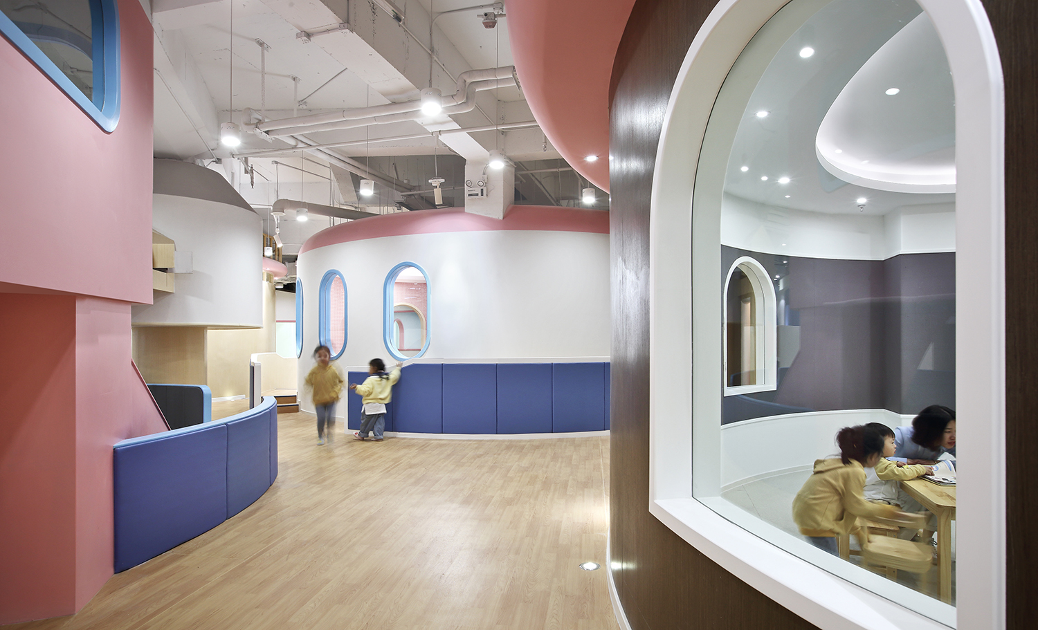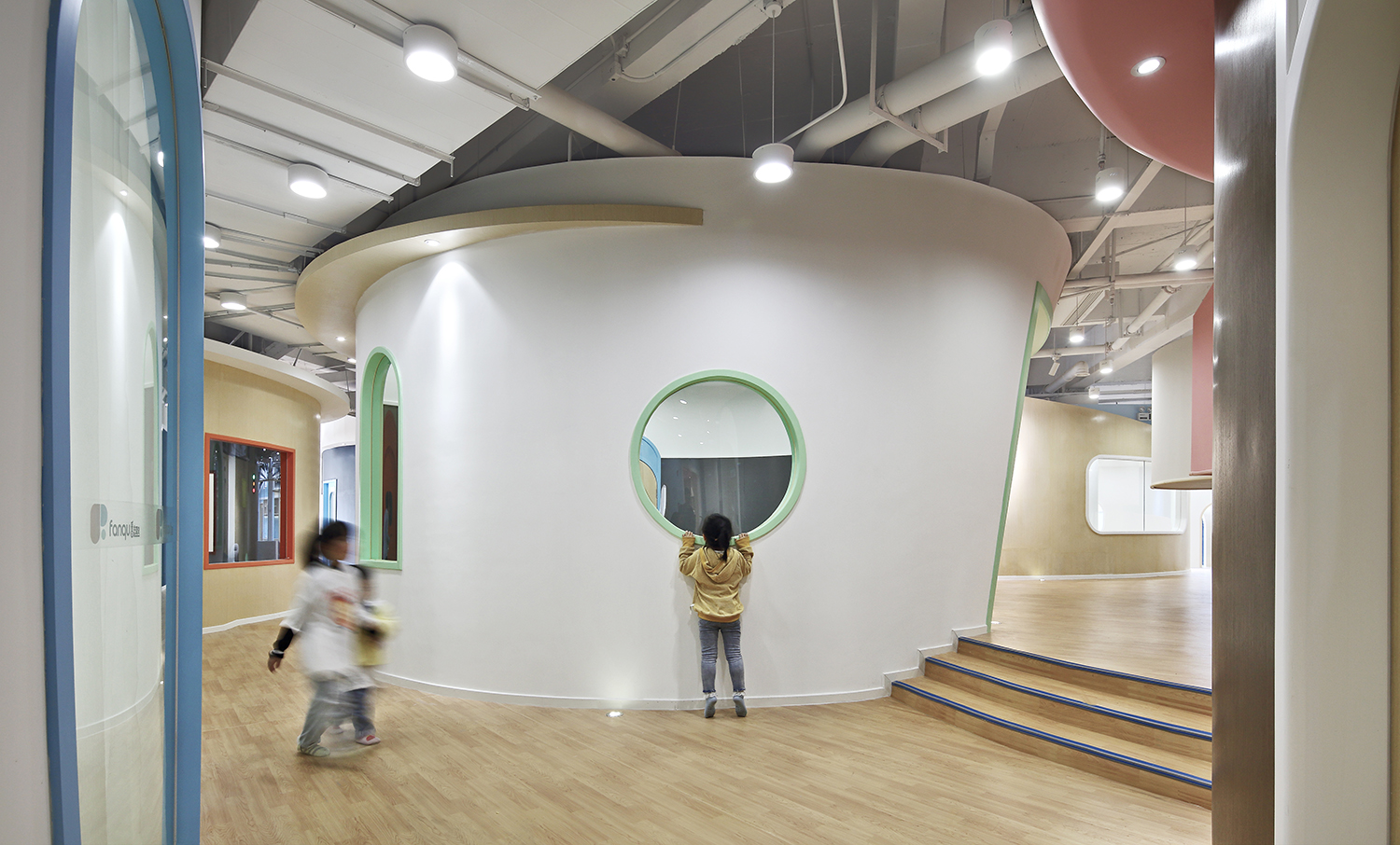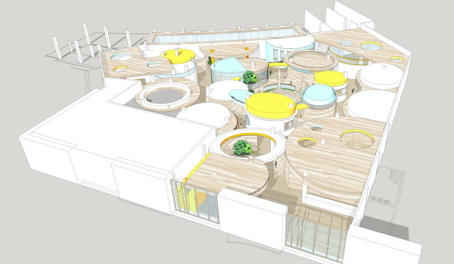 進入兒童成長中心內(nèi)部,一幢幢可愛的圓形房子矗立眼前,開闊的走道四通八達,讓人豁然開朗。