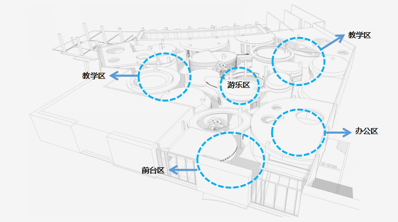 此次設(shè)計涉及早教和托育兩大版塊功能需求,包括16間教室、1個游樂區(qū),以及書吧、辦公區(qū)、廚餐區(qū)等。設(shè)計師將原有場地進行清理和重新分割,根據(jù)項目需求和場地情況將中部規(guī)劃為早教區(qū),托育教室則圍繞早教區(qū)環(huán)形安置,主門在南面,接送門在西側(cè)。