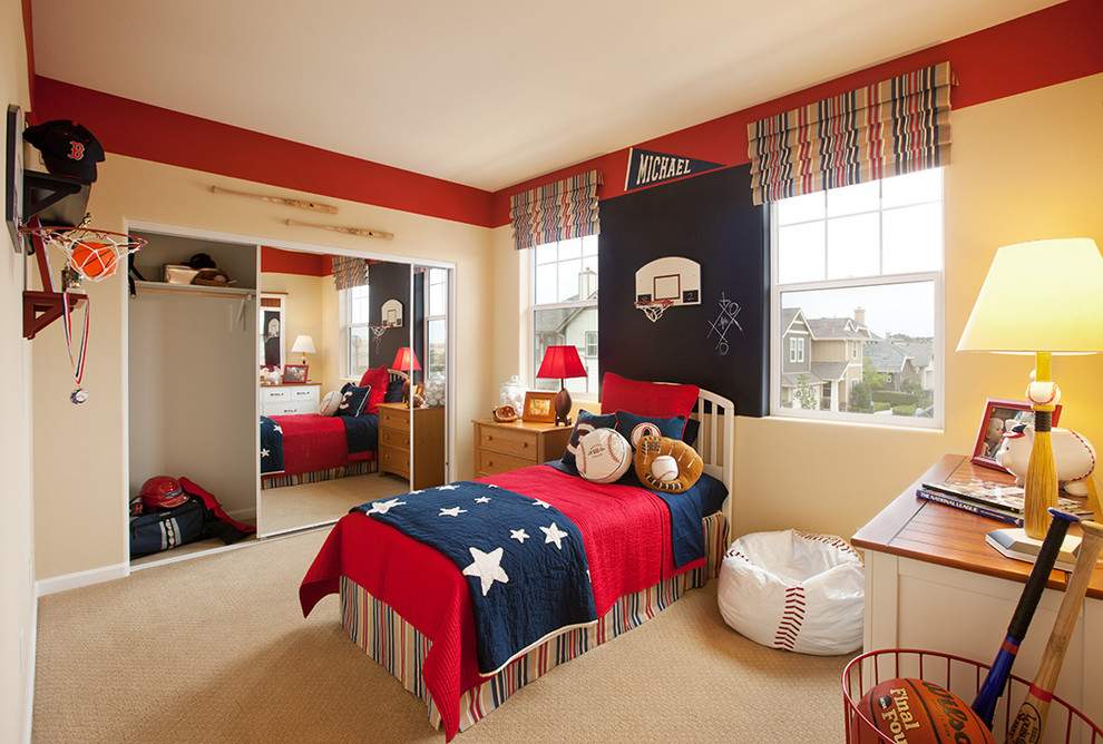 簡約的歐式風格設計,以籃球為主題,充滿強烈的運動氣息,非常適合男孩子。把靠墻的柜子門設計成鏡子,顯得房間大了許多。