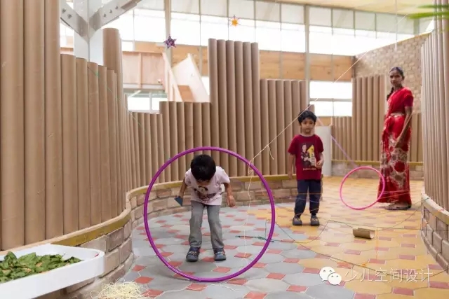 建筑包含4間教室,中心廣場邊上的一間工作室和一間幼兒啟蒙中心的房間與廣場之間有著過度的濾光板。衛(wèi)生間的設(shè)計考慮到了低領(lǐng)人群,小型的尺度不僅適合孩子,還方便監(jiān)護(hù)。衛(wèi)生間暴露的排水管與小便墻的設(shè)置能夠被孩子舒適地使用,并易于維護(hù)。