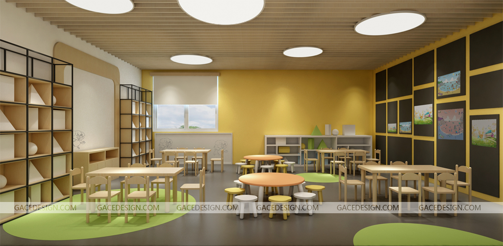 考慮到目前部分幼兒園的室內(nèi)空間不符合標(biāo)準(zhǔn),如果是過(guò)高的空間,可考慮頂面裝修或懸吊一些裝飾物,以降低其空間,改變視覺(jué)上的空曠感。頂面的表層不能太光滑,這樣有利于增強(qiáng)吸聲效果,避免產(chǎn)生眩光。如果是頂層,還要考慮隔熱情況。幼兒園設(shè)計(jì)頂面要使用隔熱、阻燃和防火性能好的裝修材料,如石膏板、鐵龍骨等。電線(xiàn)要放入阻燃管內(nèi),避免因電路故障而引發(fā)火災(zāi)。
